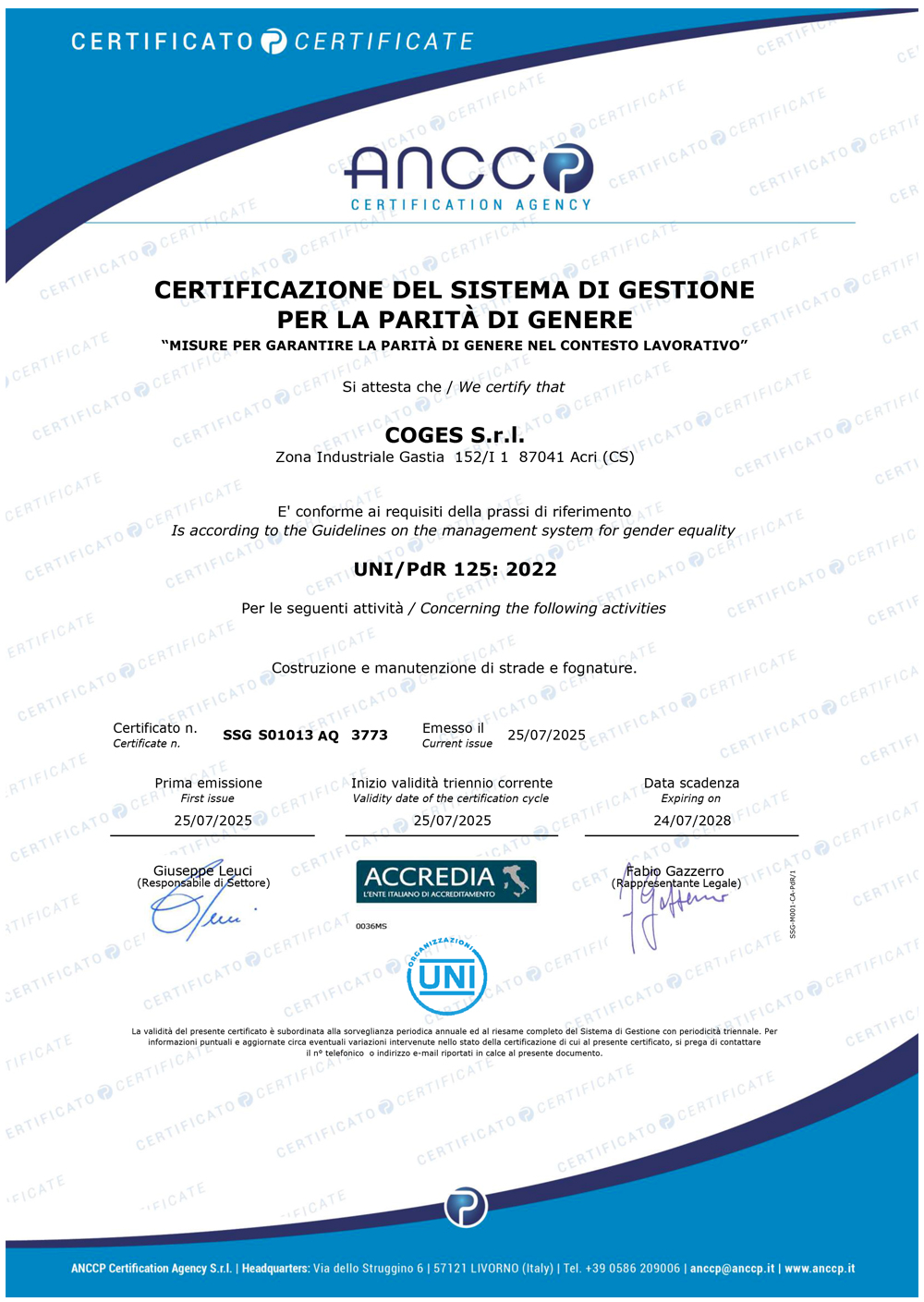 Certificato PARITA' DI GENERE